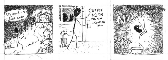 So that’s how I get ninety per cent of my ideas. Some come other ways, and I’ll take ’em any way I can, but mostly it’s this rational, relentless pursuit. Doodling seems like an unnecessary step, and, honestly, my mind-set when I’m drawing isn’t really a creative mind-set. It’s a mundane-task mind-set, like folding laundry or doing dishes. Sure, a cartoon can flit into my mind while doing those kinds of tasks, but it’s rare and I’m better off doing dishes than doodles, because if it doesn’t happen at least I’ll have clean dishes. I need that more than I need another stack of Diffee doodles.