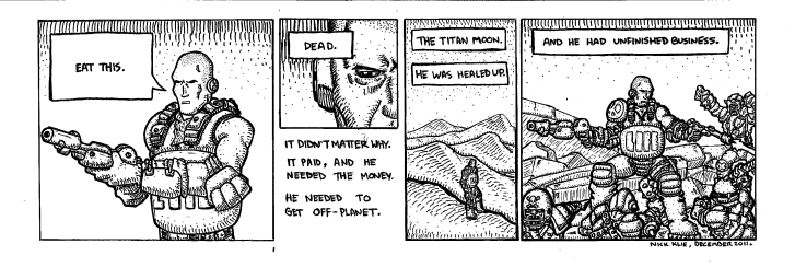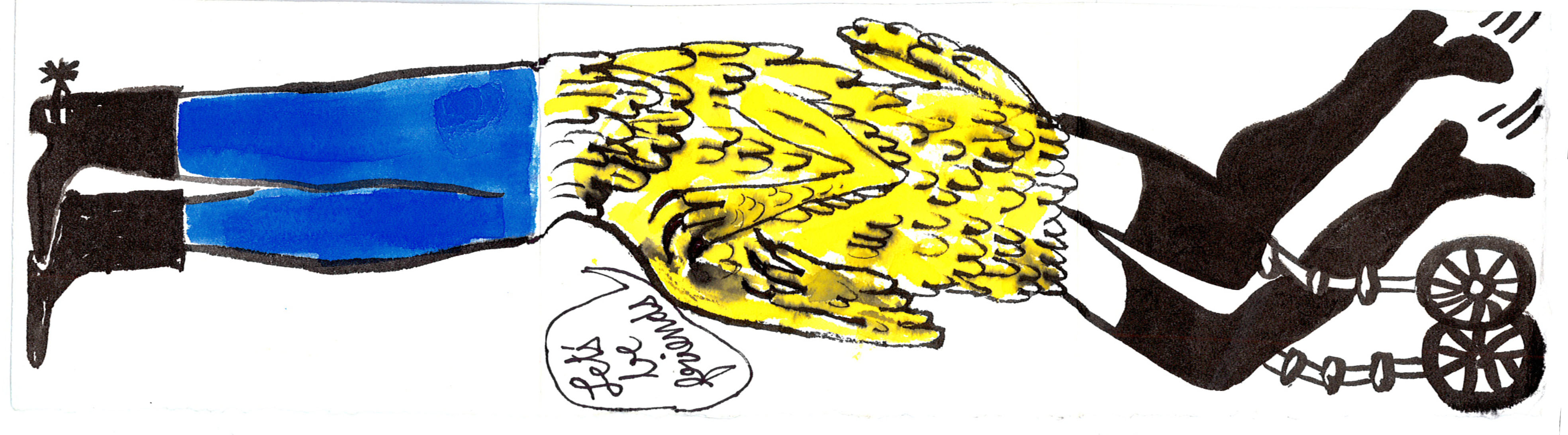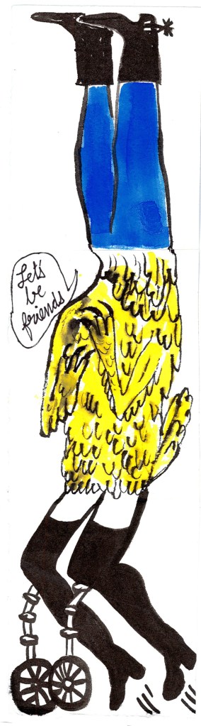 It’s not often I title these exquisite corpse drawings nor will it become a habit, but I felt a little more inspired with this one. As you probably don’t know, I consider myself a big baseball fan and I have been researching a project regarding Duchamp’s ready-made In Advance of the Broken Arm. What comes to mind for me is pitching mechanics and the recent shut down of Stephen Strasburg of the Washington Nationals. Formerly my beloved Montreal Expos, but I just couldn’t bring myself to be a Nationals fan. His arm action has been the subject of scout analysis for a while now, mostly in an unfavourable light. The crux (not to be confused with Kruk) of his arm trouble seems to be the inverted “W” rather than the action inferred by the ready-made snow shovel of Duchamp. There is some difference in opinion on this, however it makes for interesting reading, if things like pitching mechanics, Tommy John and various ligament and rotator cuff surgeries spark your interest. All this to bring me to this corpse, that was done a while back and contained both a reference to Duchamp’s ready-made and what appears to be a televised MMA bout. Thoughts of this remind of my MMA junkie friends and the techniques required for arm bars, kimoras and that rather ugly episode in UFC 140 involving Frank Mir and Big Nog. All clear? Ready-made to baseball to mma to exquisite corpse. All comes together nicely if you ask me. Well, except for the Big Nog incident, which if you haven’t checked out already is a little gruesome.