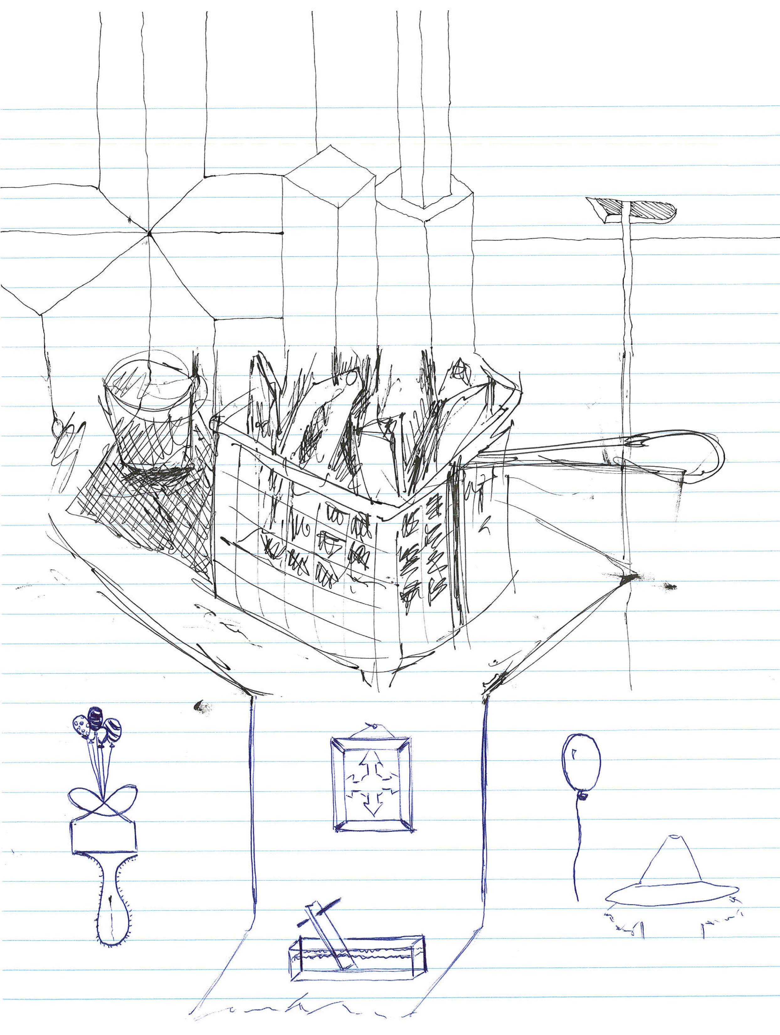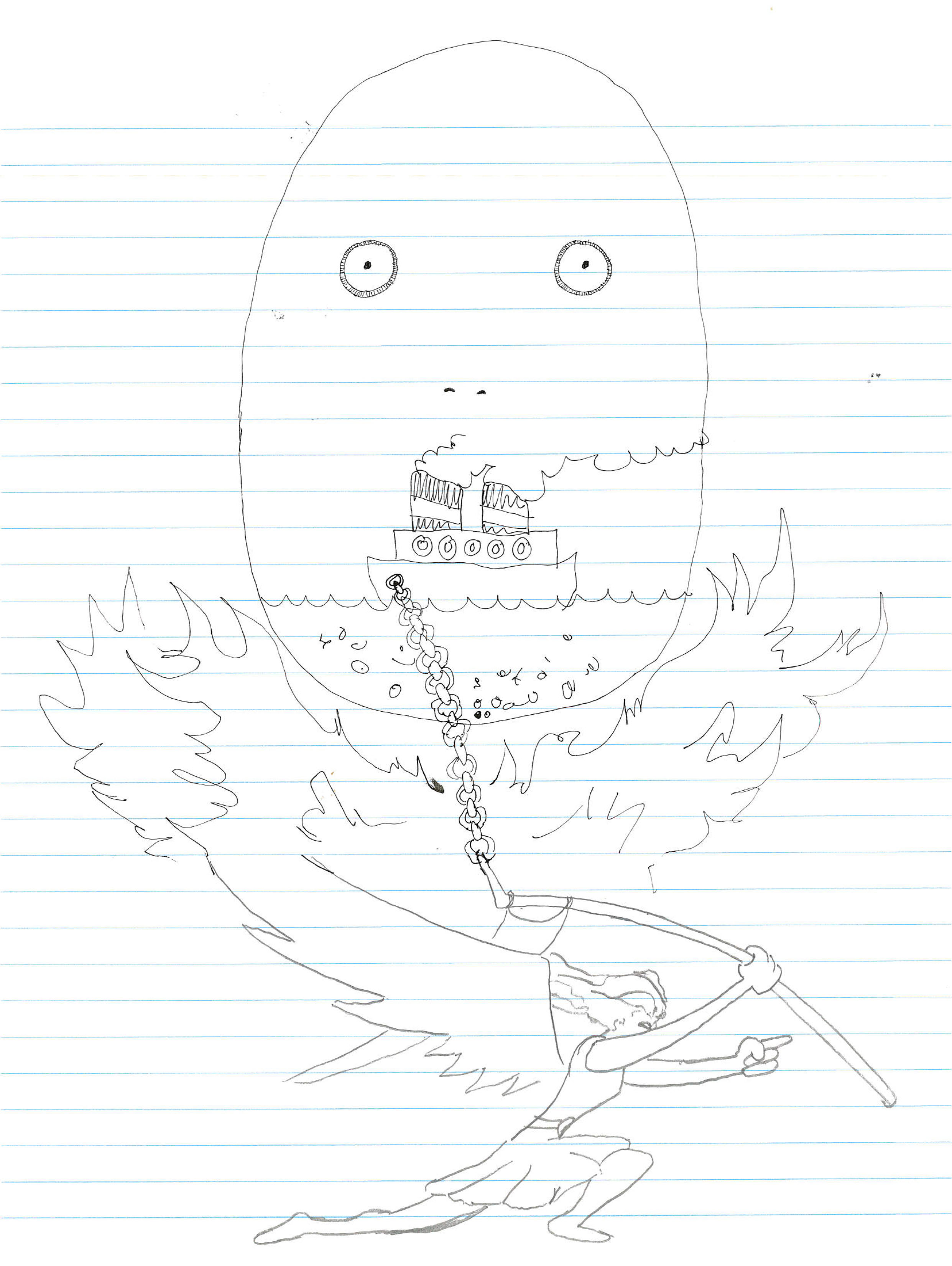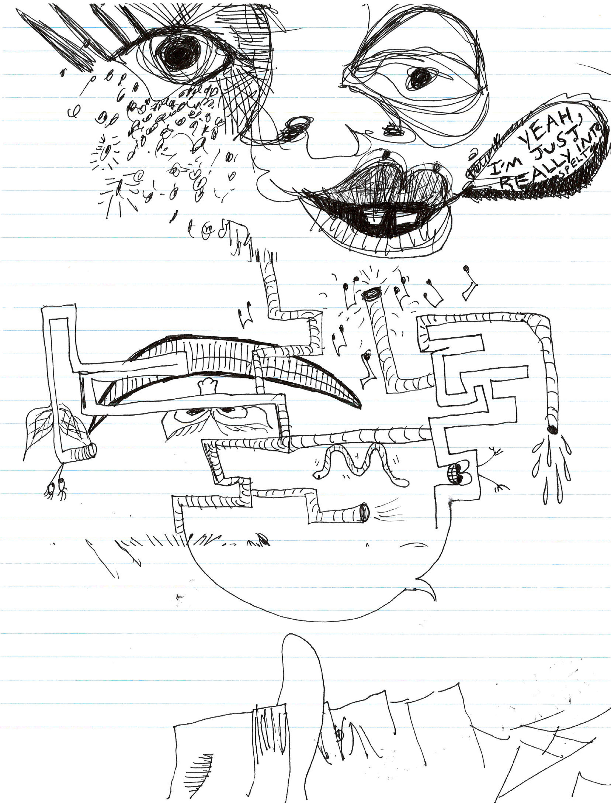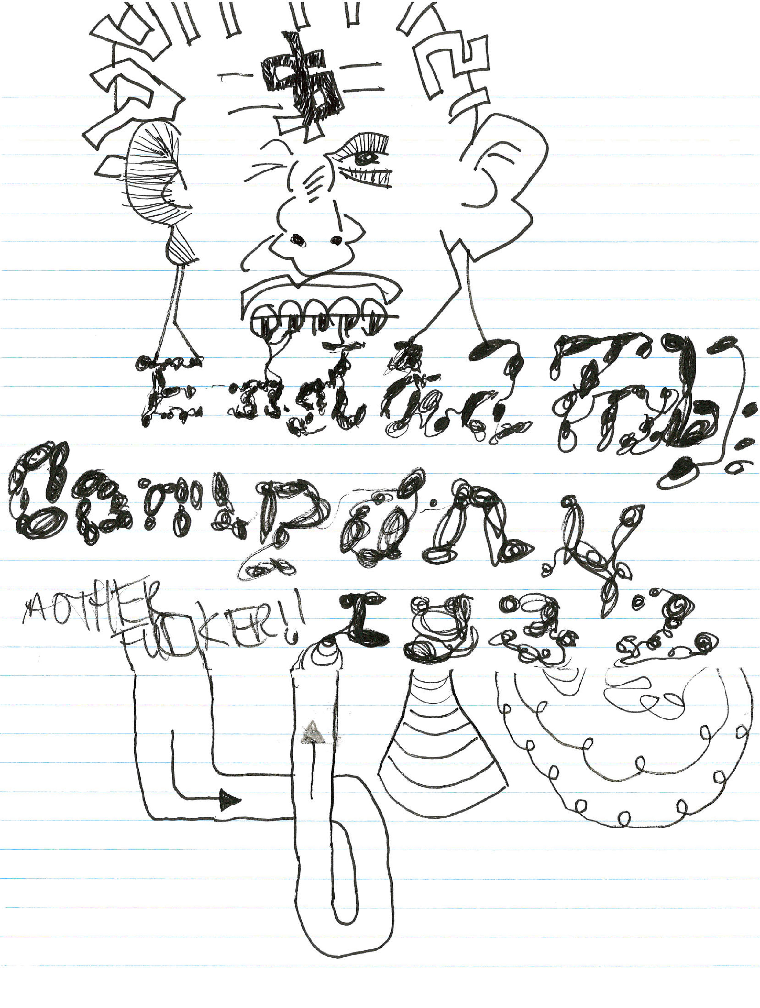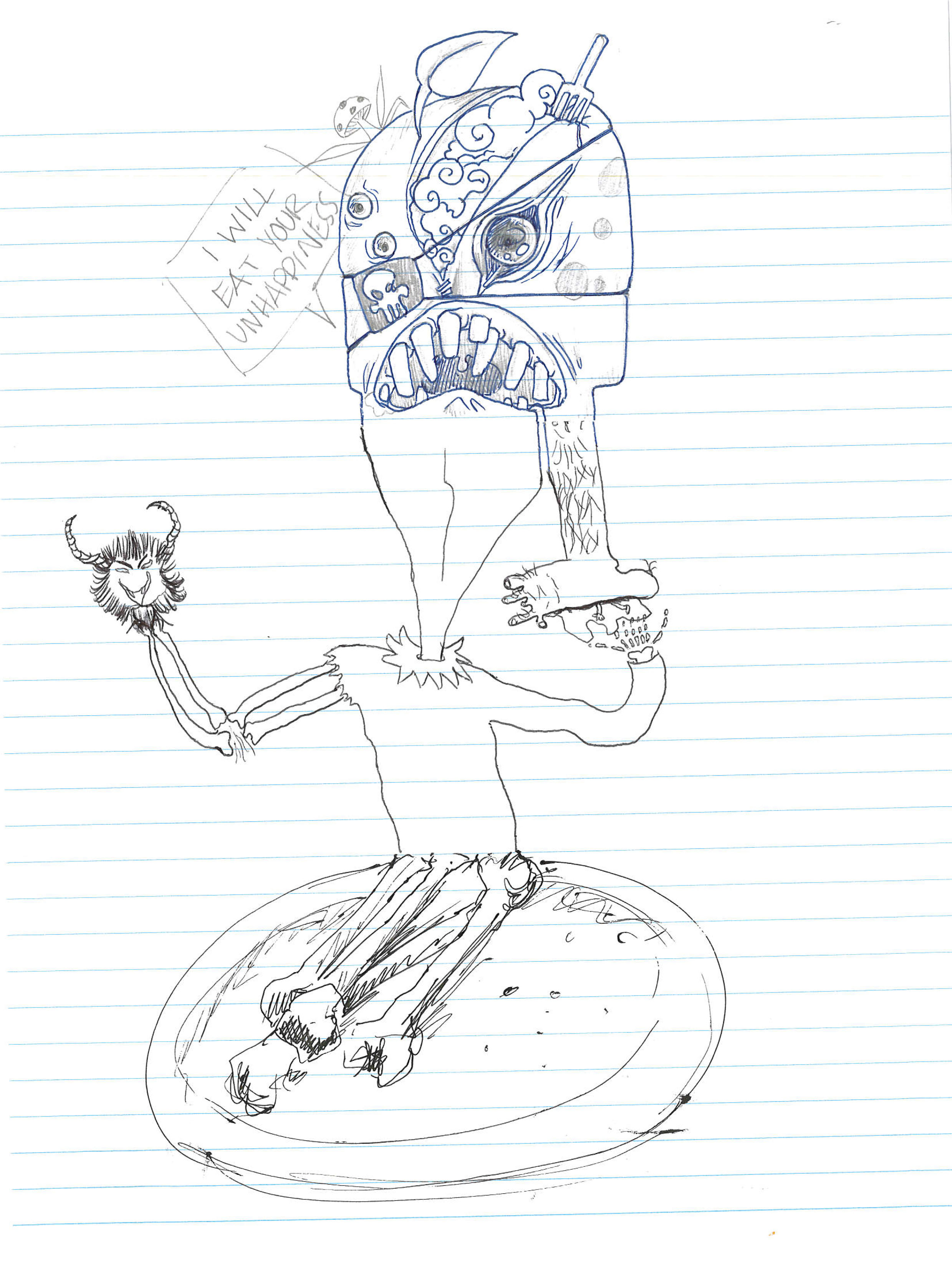 Another is Jason McLean’s No Comment, a wall of drawings based on found posters, scraps of paper and writings. Sorry, no photo of this either, but this link will give you a good idea. Part of the tour included everyone’s favourite (there’s that word again) drawing game of exquisite corpse. There were clearly people in the audience who do not draw and do not know this game, so I was very interested to see how this turned out. Also, Dr Robert Belton did not introduce this game as exquisite corpse. He instead referred to it as a surrealist drawing game, explained the process and demonstrated how to fold the paper. So. No preconceived ideas of drawing a body. Also, in reference to the beginnings of the corpse he had contributors scrawl a word or phrase on each section. A noun, a verb and a concluding word or phrase. Fortunately, he let me copy them after the talk. Results below.