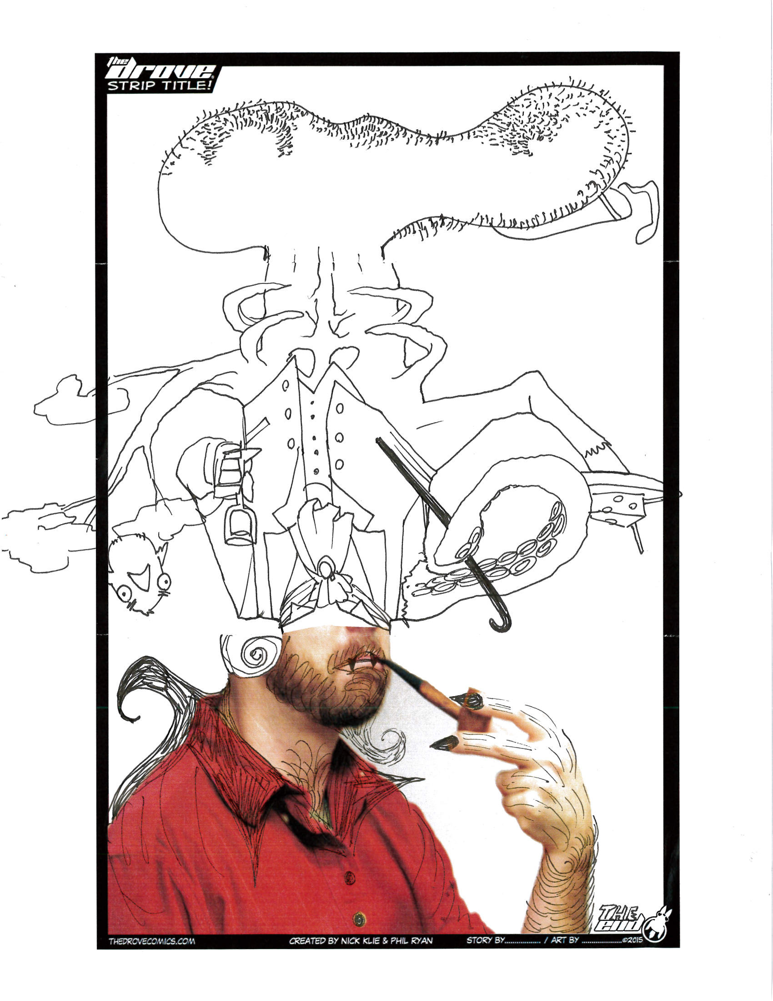 So, some friends at The Drove put out a call for guest artists for their weekly comic. If my memory serves me correctly, the call said something along the lines of “anything goes”. Yes, I am too lazy to look up the email or facebook post to remember the exact wording. I am very curious what happens when you put out the phrase “anything goes” to fans of The Drove. Since the collaborative team that is responsible – is responsible really the right word? irresponsible for The Drove somehow sounds more appropriate or inappropriate – for The Drove contributed to my Narrative Corpse project a few years ago (thanks Phil and Nick), I jumped at the chance to put something together for them. So I grabbed a few colleagues around the office and put them to work. Thanks to Nelina, Melaina and Charo for putting excellent work into The Drove corpse and of course to Nick for the words and balloons and dealing with all the photoshop issues that I still fail to negotiate or maybe it’s Phil that does that. Thanks to Phil too. Some of the best writing in comics this year! I feel more than a little honoured to kick things off for guest artist spots on The Drove. Thanks for the inspiration, It started with those Drove helmets and the pin ups that show up in the strip from time to time. Here’s what we gave them to work with.