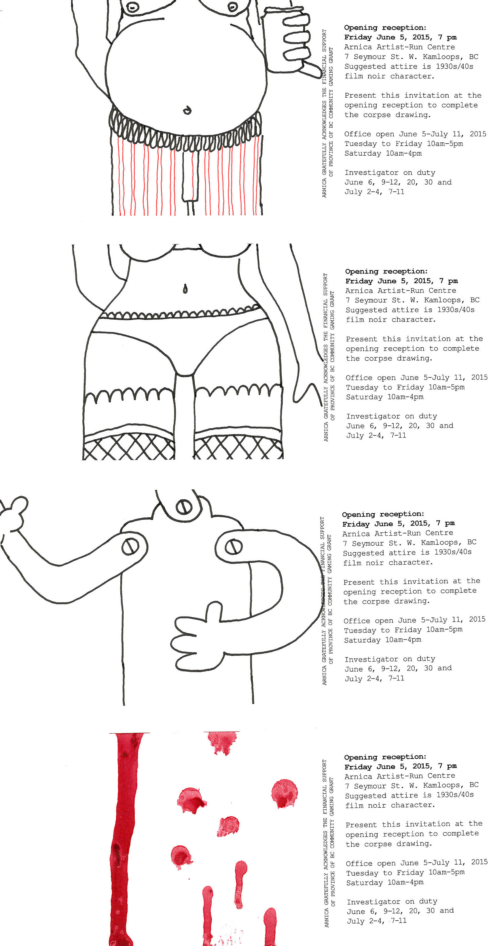 With 2 weeks until we open our physical office space, here are four pieces of our exquisite corpse invitation to the opening. Of course, each invitation is unique and contains one piece of an exquisite corpse. Pieces of that corpse have been drawn over 3 or 4 different invites, so your invitation will fit together with other guest’s invitations. As these have been disseminated people are asked whether they’d like an invite with a drawing already on it or a blank containing a few lines overlapped from someone else’s work that they can then complete. Guests are then encouraged to bring their invitation to the office seek each other out to put together the corpse. Present your pieced together corpse at the office and we will present you with artwork from the office. Thank you to all that helped be start the corpses.