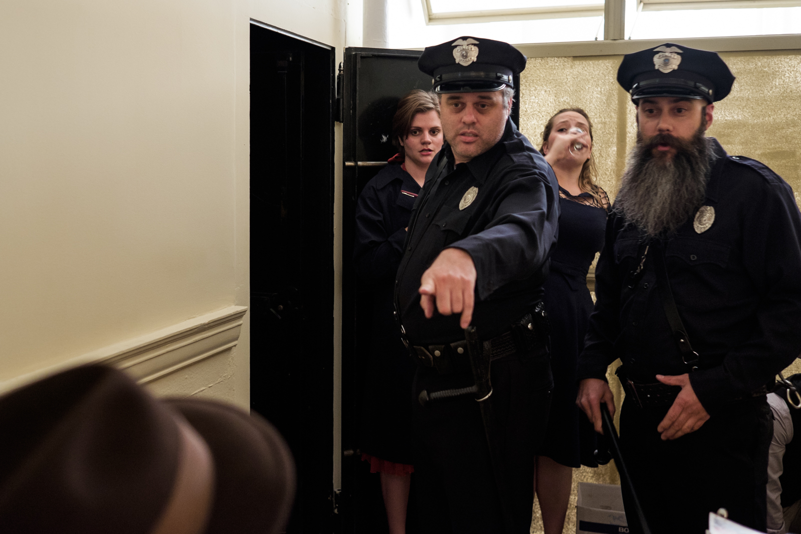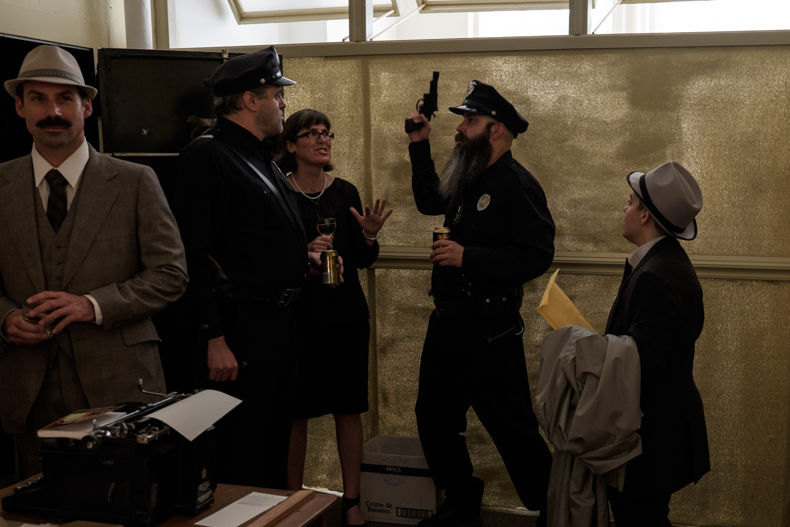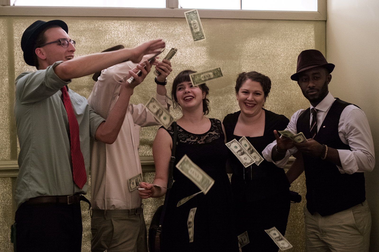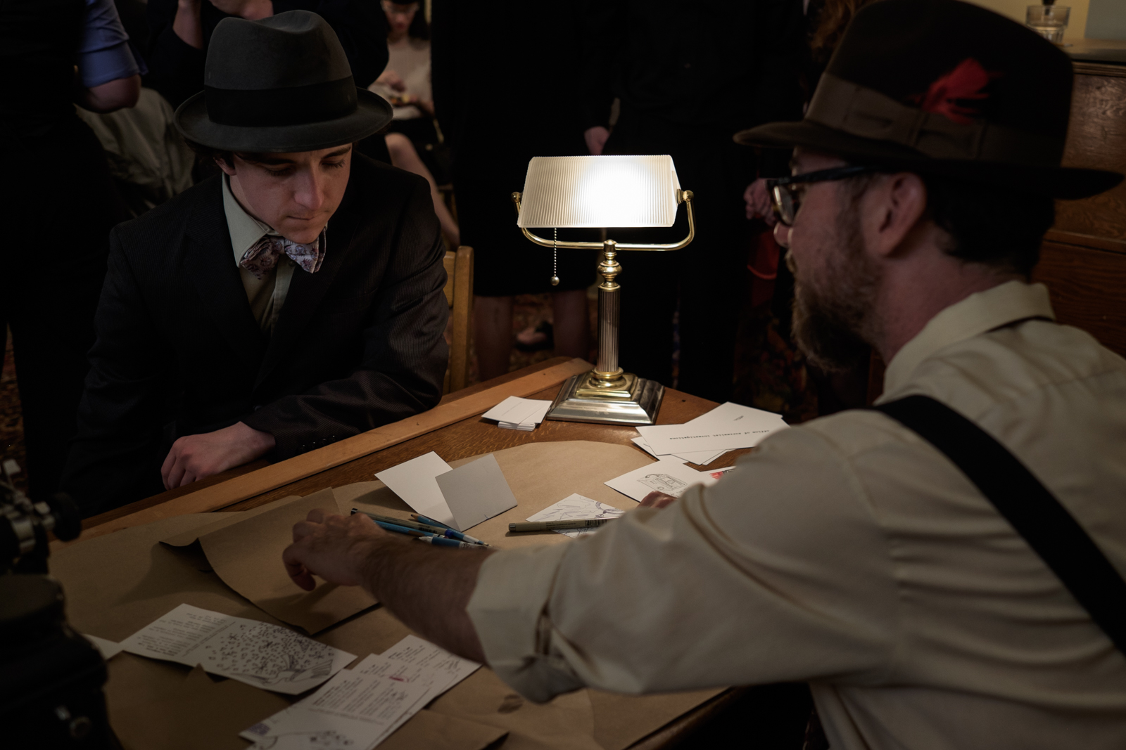 So, we had an opening, complete with bank vault speakeasy (a sweltering one at that), band, and surrealist activity throughout the night. Thanks to press photographer Devon Lindsay for the photos. Drawing games and investigations ruled the early part of the evening with the odd disruption and illicit throwing of dice.