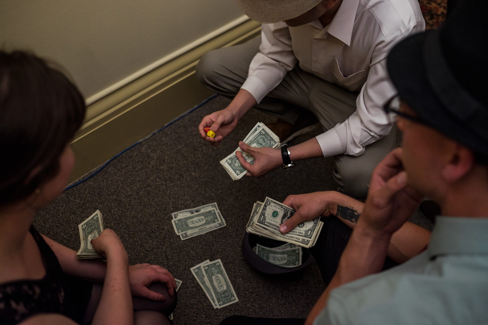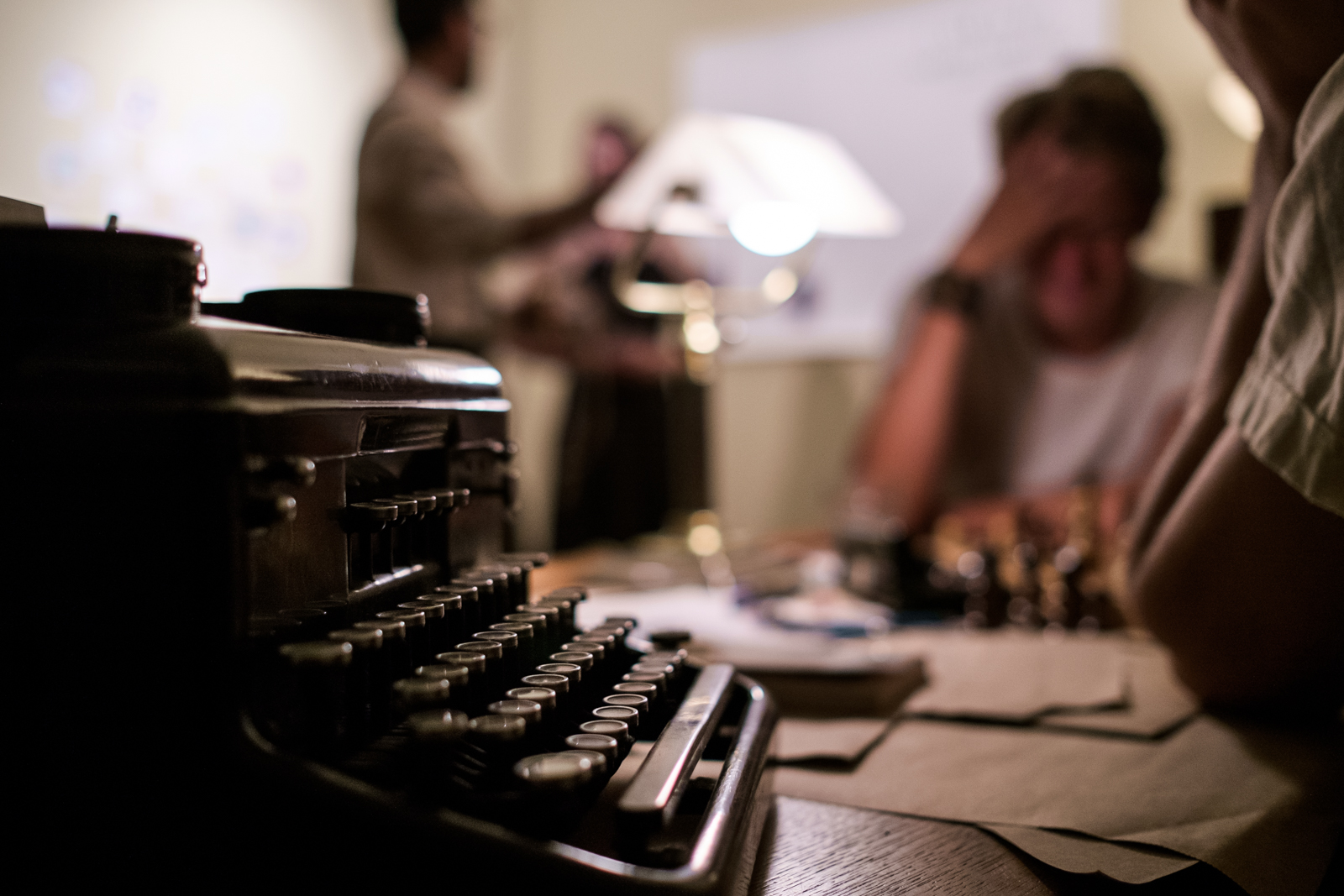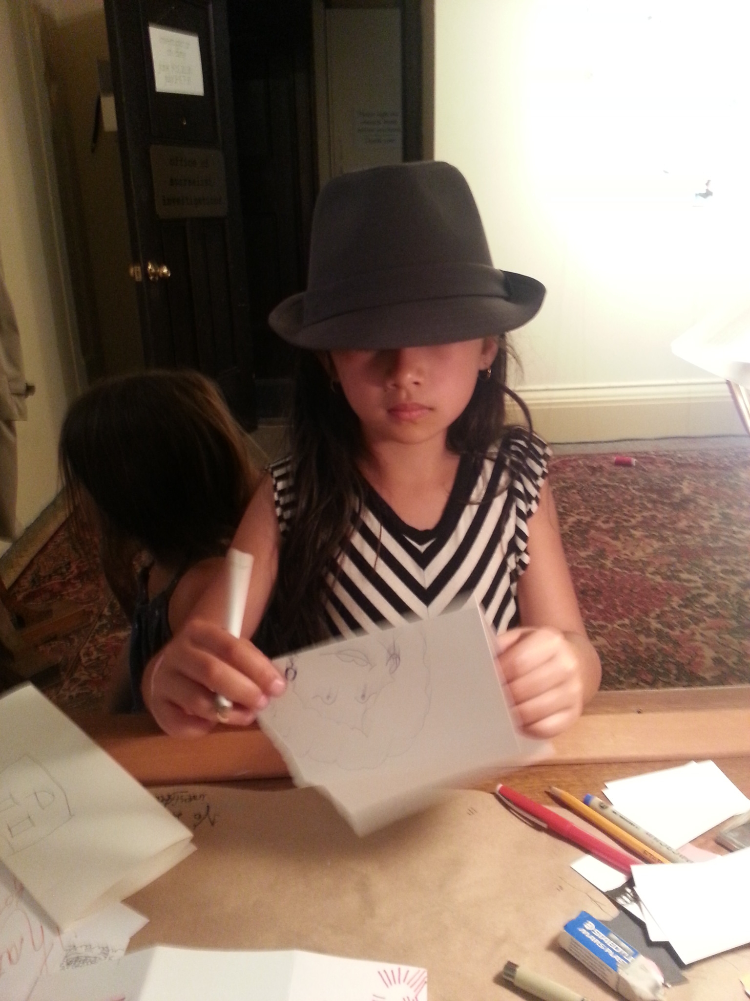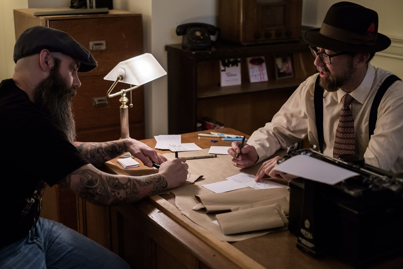 So, we had an opening, complete with bank vault speakeasy (a sweltering one at that), band, and surrealist activity throughout the night. Thanks to press photographer Devon Lindsay for the photos. Drawing games and investigations ruled the early part of the evening with the odd disruption and illicit throwing of dice.