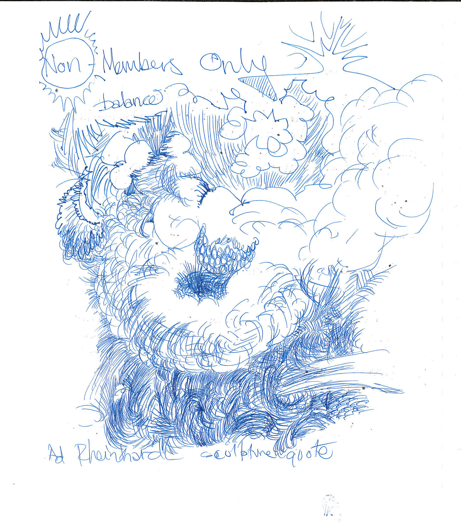 This started off as an automatic drawing and then turned into something. Correction, this started as a note looking for an Ad Reinhardt quote about bumping into sculpture as you back up to look at painting. Non-members Only is a sign I think I saw somewhere in Vancouver. Anyone know the place. Seems it was neon at a club or music venue or something. Then came the drawing.