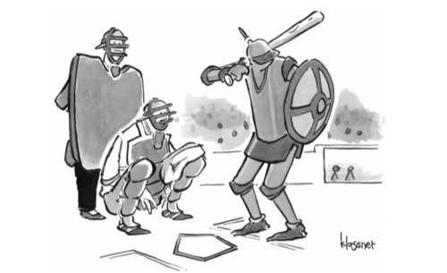 People work in different ways and I am particularly interested in the doodle first approach because that is what I find myself doing a lot and taking ideas from those doodles. In a sense both modes work as automatic exercises, though in a more organised way. This isn’t always entirely random, but I am intrigued by the fact that both cartoonists start with a blank canvas avoiding all distraction. The New Yorker caption contest plays out like a doodle first assignment. You get a drawing and then you find an appropriate caption. My captions usually come in the midst of a ballgame when my mind has had a rest from the image for a while.