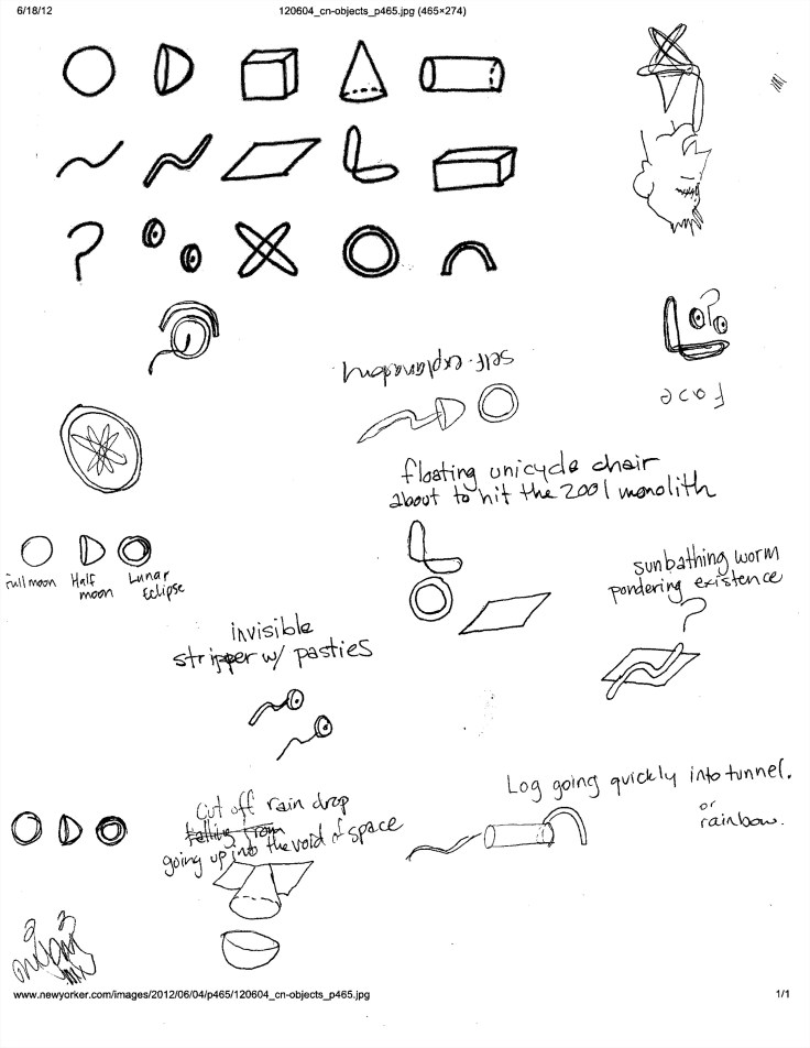 Not my idea, but I do enjoy introducing and playing drawing games, so I took Bob Mankoff’s ideas and had a few people put together some creations.